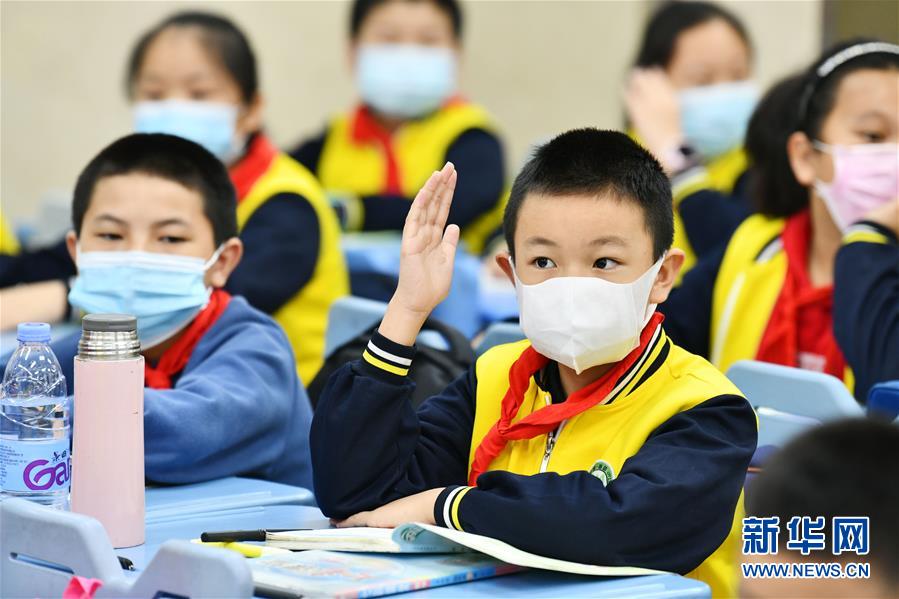 5月25日,貴陽市中天北京小學未來方舟校區(qū)一名學生在開學第一課上舉手發(fā)言。新華社記者歐東衢攝