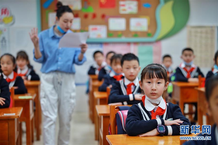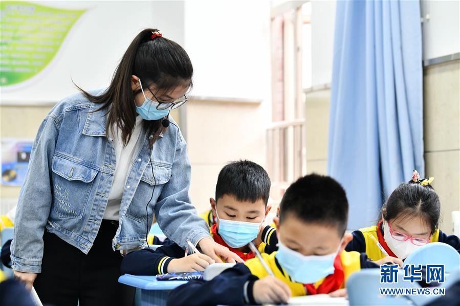 5月25日,廣州市荔灣區(qū)蔣光鼐紀念小學的老師在給學生上開學第一課。當日,廣州市各小學一至三年級學生正式開學復課。至此,廣州市中小學各年級已全部開學復課。新華社記者盧漢欣攝