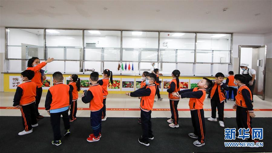 5月25日,廣州市荔灣區(qū)蔣光鼐紀念小學的老師在校門口指導返校的學生進行手部消毒。當日,廣州市各小學一至三年級學生正式開學復課。至此,廣州市中小學各年級已全部開學復課。新華社記者盧漢欣攝