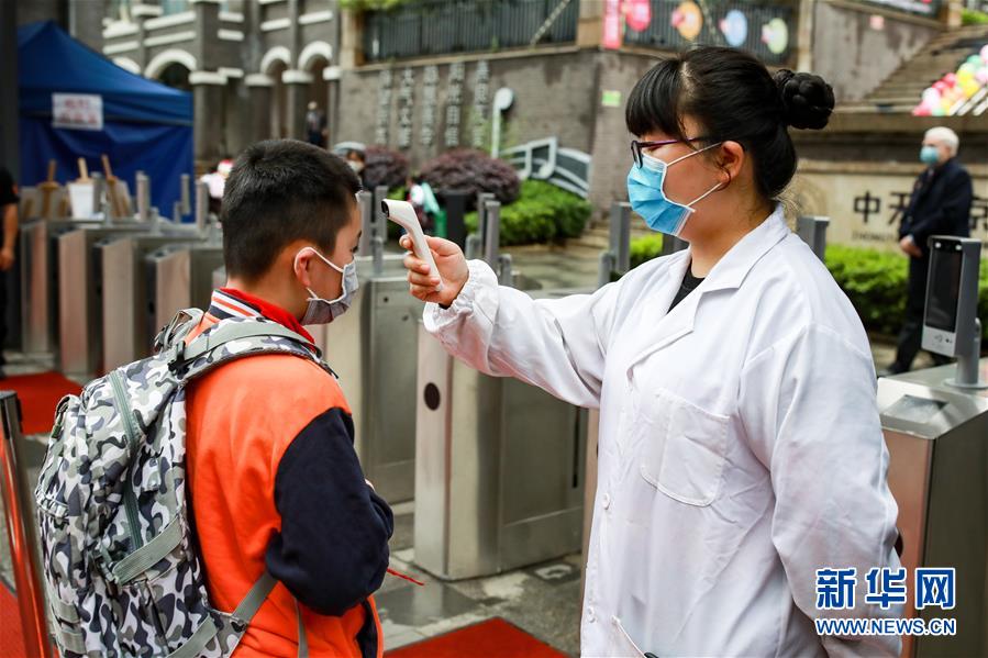 5月25日,貴陽市中天北京小學未來方舟校區(qū)學生在返校時進行體溫檢測。新華社記者歐東衢攝