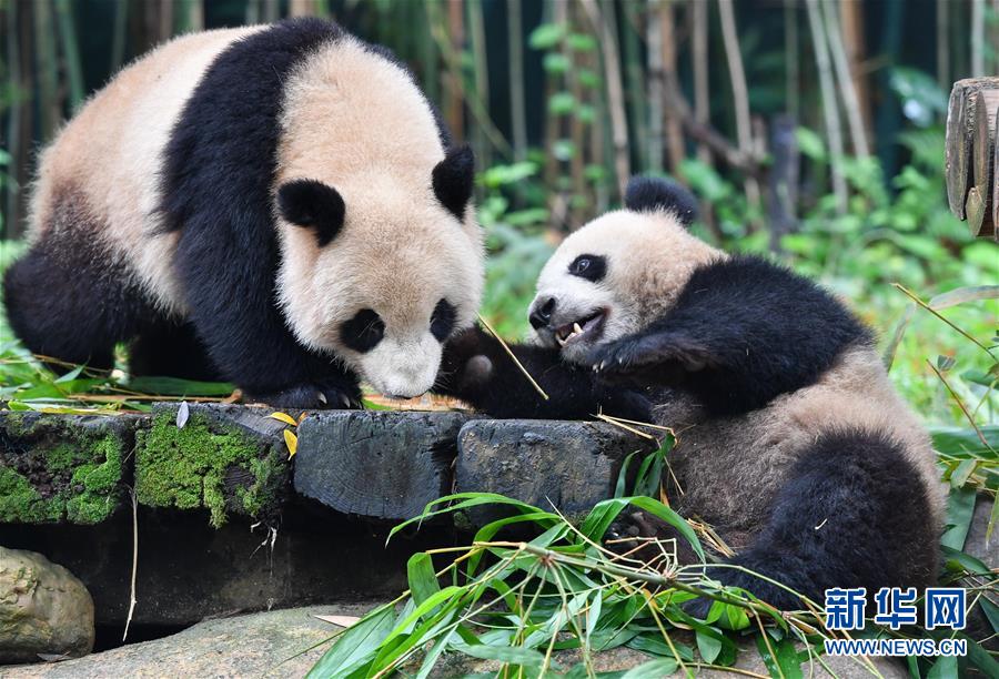 5月27日,大熊貓婷仔和隆仔在享受竹子大餐。正在享受竹子大餐的廣州長隆野生動物世界大熊貓婷仔被大熊貓隆仔搶食,兩只大熊貓上演一場爭食戲碼。新華社記者劉大偉攝