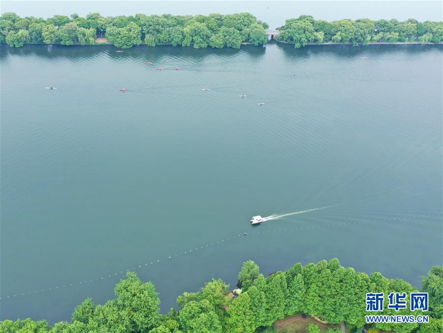 5月27日,船只在西湖上行駛(無(wú)人機(jī)照片)。隨著氣溫升高,杭州西湖綠意蔥蘢,展現(xiàn)出柔美的湖光山色。新華社記者翁忻旸攝
