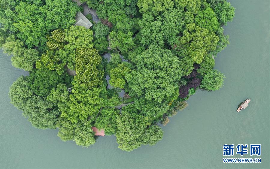 5月27日,船只在西湖湖心亭附近行駛(無(wú)人機(jī)照片)。隨著氣溫升高,杭州西湖綠意蔥蘢,展現(xiàn)出柔美的湖光山色。新華社記者翁忻旸攝