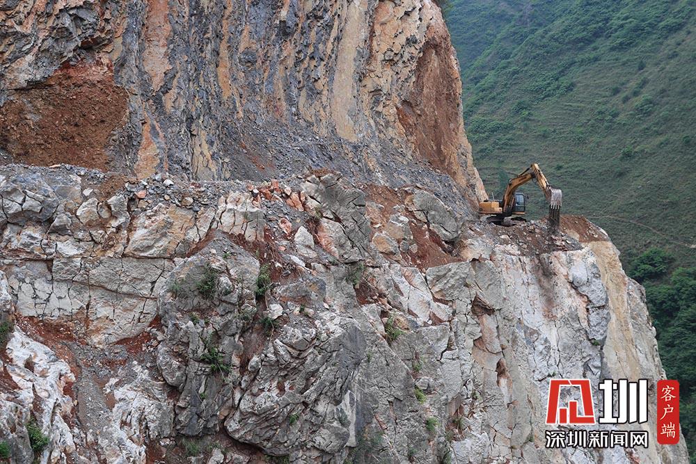 2020年5月27日,在貴州省畢節(jié)市納雍縣化作鄉(xiāng)雙巖頭村,挖掘機(jī)在觀音巖的懸崖邊修路。