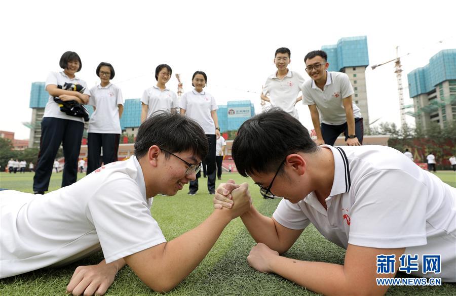 6月9日,河北省衡水市第二中學(xué)的高三學(xué)生在操場進(jìn)行掰手腕比賽。2020年高考臨近,河北省衡水市第二中學(xué)組織開展多種形式的集體“減壓”活動,幫助高三學(xué)生在緊張備考之余釋放身心壓力,以輕松、樂觀、自信的心態(tài)迎接高考。新華社記者朱旭東攝