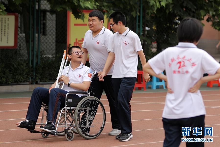 6月9日,河北省衡水市第二中學(xué)的高三學(xué)生推著一名腳部受傷的同學(xué)在操場上聊天散步。2020年高考臨近,河北省衡水市第二中學(xué)組織開展多種形式的集體“減壓”活動(dòng),幫助高三學(xué)生在緊張備考之余釋放身心壓力,以輕松、樂觀、自信的心態(tài)迎接高考。新華社記者朱旭東攝