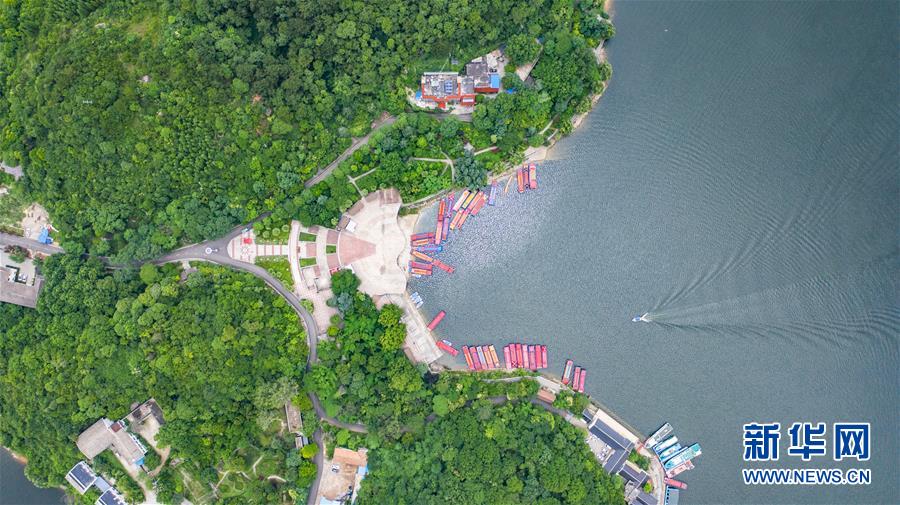 6月21日,游客乘船在紅楓湖景區(qū)游覽(無人機照片)。夏至?xí)r節(jié),貴州省清鎮(zhèn)市紅楓湖景區(qū)草木蒼翠,秀麗的湖光山色吸引不少游客前來游玩。新華社記者陶亮攝