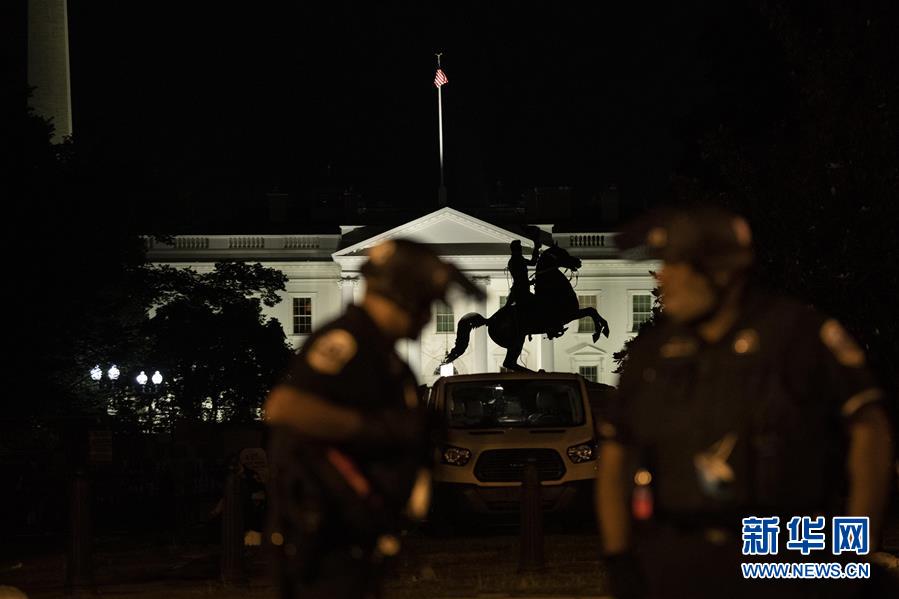 6月22日,警察在美國華盛頓白宮附近警戒。美國警察和示威者22日晚在首都華盛頓市白宮北側拉斐特廣場發(fā)生沖突并對峙。美國總統(tǒng)特朗普在社交媒體上說,許多人因破壞廣場上美國前總統(tǒng)安德魯·杰克遜的雕像及附近圣約翰圣公會教堂被逮捕。新華社記者劉杰攝