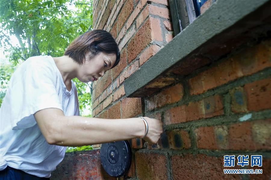 7月1日,地質(zhì)災(zāi)害監(jiān)測員侯芳對一處農(nóng)房的墻上裂縫寬度進(jìn)行測量。新華社記者劉潺攝