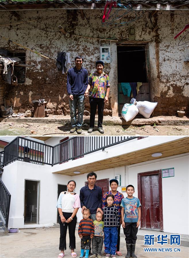 拼版圖片:上圖為且沙次干、阿達(dá)么日雜夫婦倆在阿布洛哈村3組老屋土坯房前留影(6月27日攝);下圖為且沙次干一家人在集中安置點(diǎn)新居前留影(6月30日攝)。