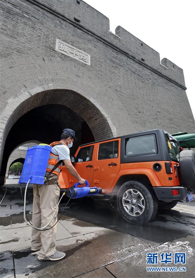 7月4日,防疫人員對進入宛平古城的車輛進行消毒。當日,北京市豐臺區(qū)組織防疫人員、安全監(jiān)察部門人員對社區(qū)、超市、公共場所進行大規(guī)模環(huán)境消毒及疫情隱患排查,全力保障市民生活和工作環(huán)境安全。新華社記者 李欣 攝