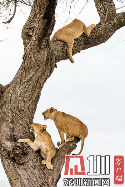 攝影師抓拍獅子上樹畫面 為爭(zhēng)奪位置憤怒咆哮互相攻擊