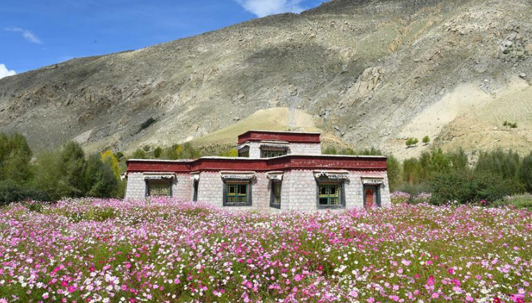 時值中秋,西藏拉薩市尼木縣的山谷間,大片波斯菊爭相盛開,宛如花的海洋。