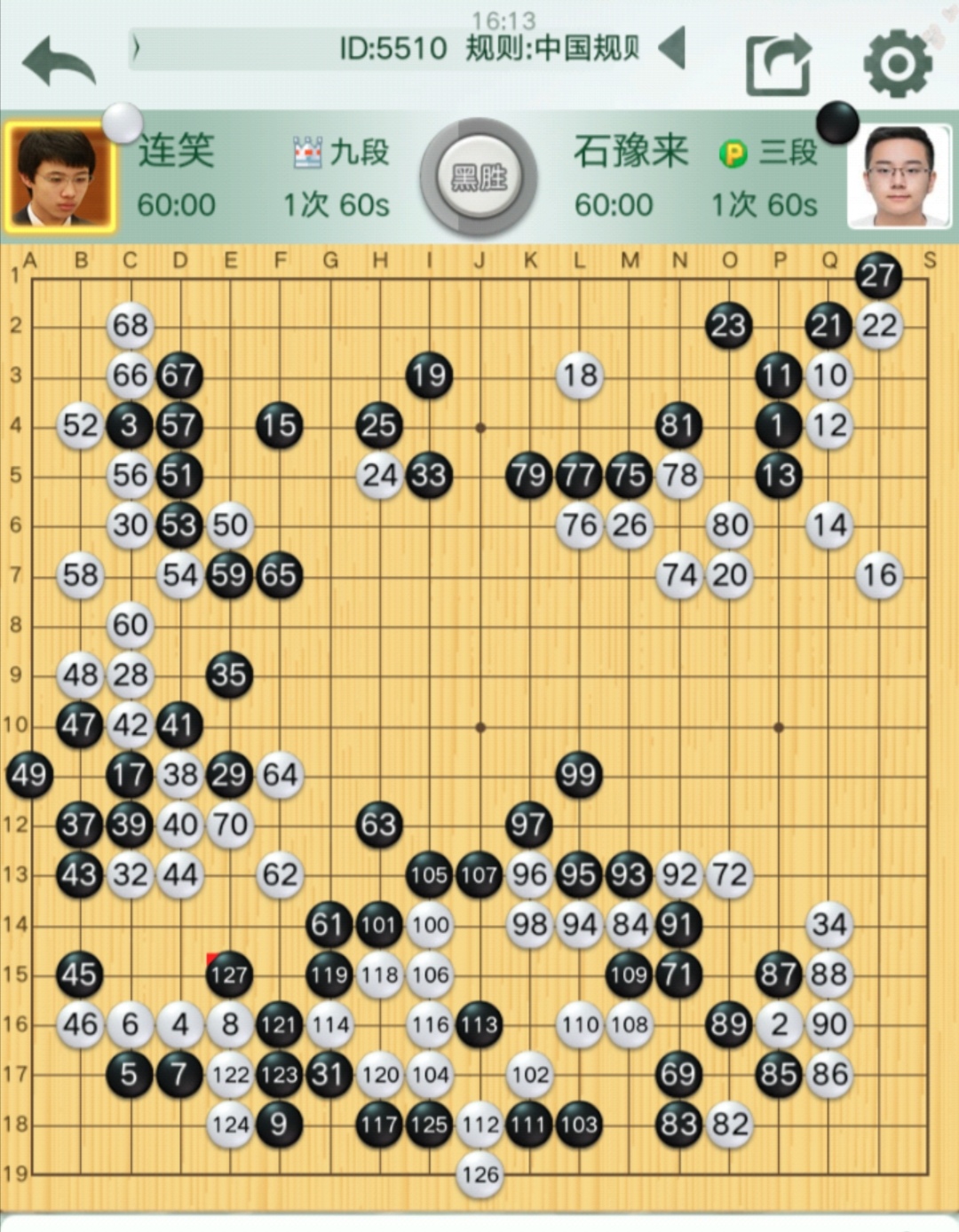 第四臺(tái)連笑九段VS石豫來三段(對(duì)局棋譜)。石豫來又發(fā)猛力,再下一城。連笑九段前三輪皆敗,本輪執(zhí)白對(duì)石豫來三段,先手壓縮上邊盤黑陣后優(yōu)勢(shì)在握,但隨即白棋打入下邊盤黑陣全部遭屠,連笑再敗一局,狀態(tài)低迷之極。