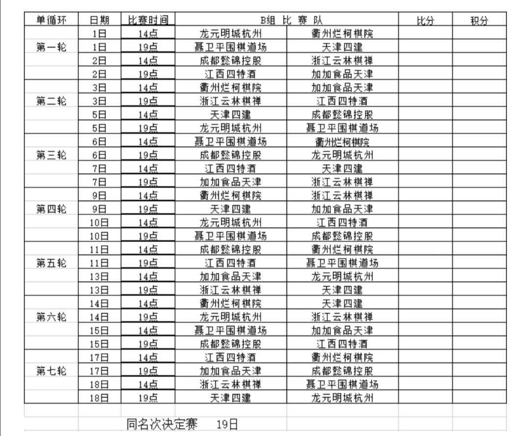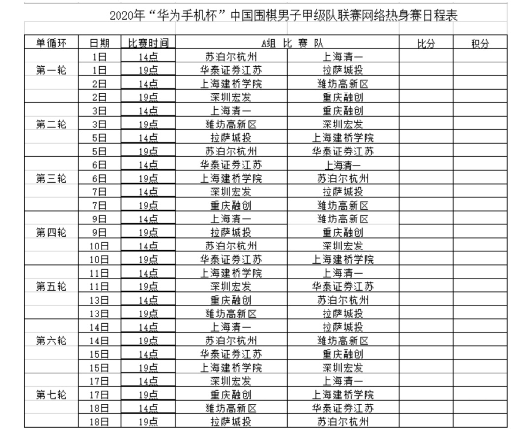 附2:2020年“華為手機(jī)杯”中國(guó)圍棋男子甲級(jí)隊(duì)聯(lián)賽網(wǎng)絡(luò)熱身賽AB兩組日程表
