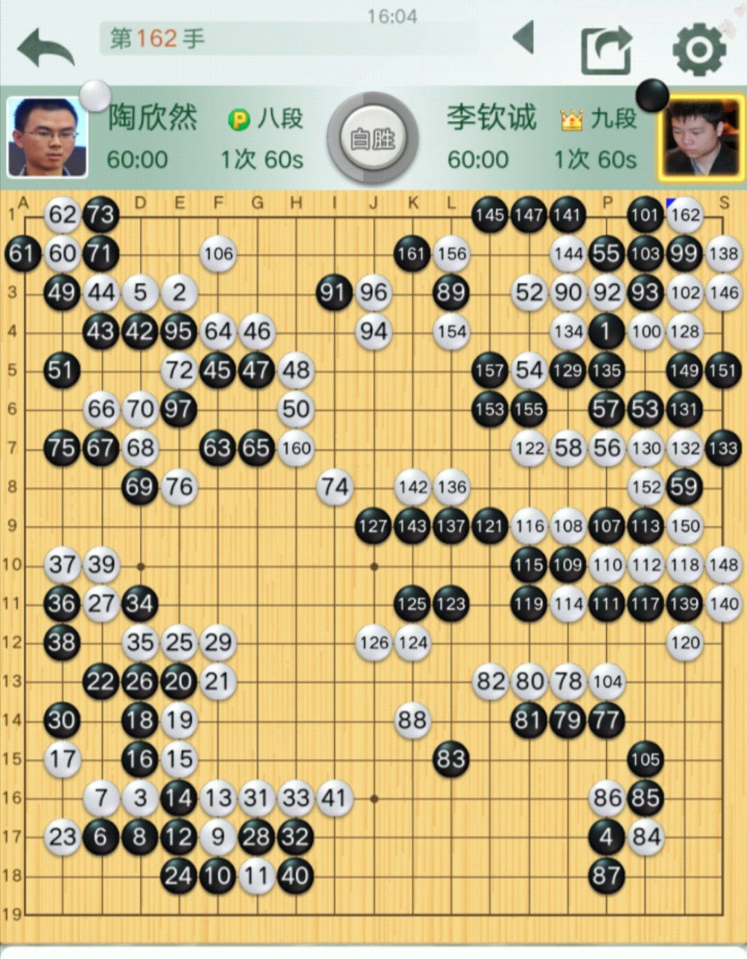 第三臺(tái)李欽誠(chéng)九段VS陶欣然八段(對(duì)局棋譜)。陶欣然率先鳴金,贏下一局。領(lǐng)隊(duì)梁偉棠九段對(duì)這盤棋很贊賞,認(rèn)為陶欣然這盤棋下得非常漂亮,氣勢(shì)磅礴,有宇宙流再現(xiàn)的感覺。開局在左下角形成白棋取外勢(shì),黑棋取實(shí)地的局面后,陶欣然將外勢(shì)發(fā)揮到淋漓盡致,在上面左右兩個(gè)角都繼續(xù)貫徹意圖,全力推進(jìn),形成了從上邊至中腹的巨大模樣,特別是在右下角一步五路尖沖,技驚四座,后來黑棋勉強(qiáng)進(jìn)來中腹破空,遭到陶欣然的全部殲滅。白棋僅162手,就取得了勝利!技驚四座那步棋是78手,猶如絕藝附身。