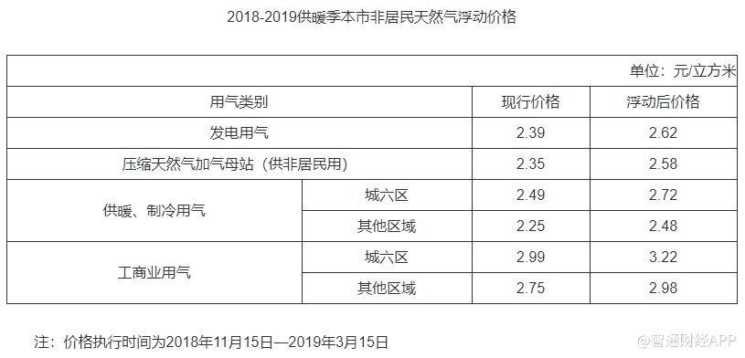 一、2018年11月15日至2019年3月15日,本市非居民用天然氣銷售價格上浮0.23元/立方米(具體價格見附件)。其他時間按照北京市發(fā)展和改革委員會《關(guān)于調(diào)整本市非居民天然氣銷售價格的通知》(京發(fā)改〔2018〕1356號)規(guī)定的價格標(biāo)準(zhǔn)執(zhí)行。