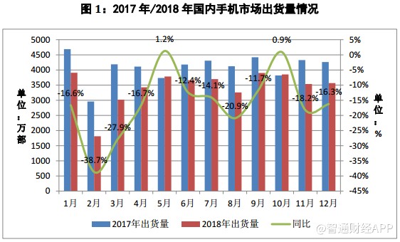 智通財(cái)經(jīng)APP獲悉,中國(guó)信通院發(fā)布12月份國(guó)內(nèi)手機(jī)出貨量報(bào)告,2018年12月,國(guó)內(nèi)手機(jī)市場(chǎng)總體出貨量3567.4萬(wàn)部,同比下降16.3%,環(huán)比增長(zhǎng)0.9%;2018年全年,國(guó)內(nèi)手機(jī)市場(chǎng)總體出貨量4.14億部,同比下降15.6%。