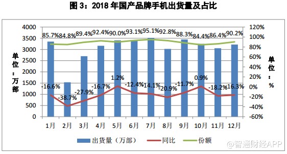 2018年全年,國(guó)產(chǎn)品牌手機(jī)出貨量3.71億部,同比下降14.9%,占同期手機(jī)出貨量的89.5%;上市新機(jī)型695款,同比下降29.4%,占同期手機(jī)上市新機(jī)型數(shù)量的91.0%。