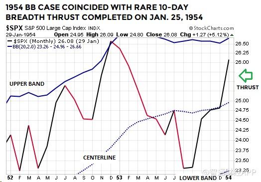 1954年1月最后一個交易日結(jié)束后,當時的布林通道月線圖與2019年1月末時的極為相似: