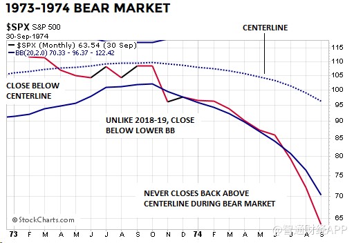 下圖是1973-74年時的情形,標普500指數(shù)在整個熊市期間都無法重新回到布林通道中軌之上。與2019年(即到目前為止)不同的是,1973年11月標普500指數(shù)收于下軌以下: