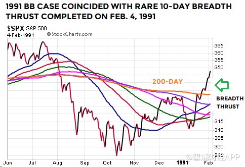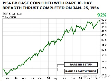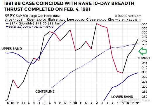 上述布林通道技術形態(tài)屬較為罕見的類型。值得注意的是,1954年和1991年時的另一技術指標,廣量沖力指標,基本上與2019年1月21日出現(xiàn)的廣量沖力指標形態(tài)類似。因此,在1954年、1991年和2019年,標普500指數(shù)走出了布林通道及廣量沖力指標都相似的技術形態(tài)。