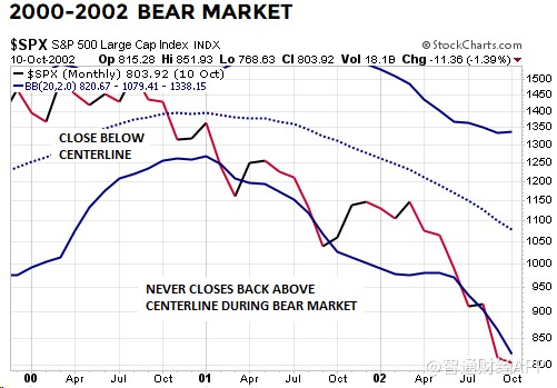 在2007年10月股市見頂之后,標普500指數(shù)在2008年1月收于布林通道月線中軌以下,在熊市期間都無法重新回到布林通道中軌以上。2008年6月標普500指數(shù)收于下軌以下: