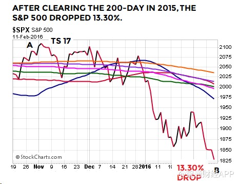 收高于200日均線并非安全信號。2015年,標普500指數(shù)連續(xù)8個交易日收于200日上方,但隨后下跌了13.30%: