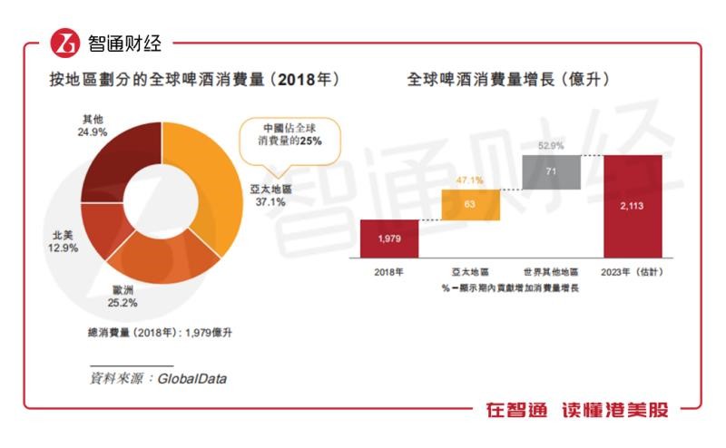 從行業(yè)角度來看,根據(jù)GlobalData的數(shù)據(jù),截至2018年,按消費(fèi)量及價值計(jì)算,亞太地區(qū)是全球最大啤酒消費(fèi)市場,也是全球啤酒銷量增速最快的地區(qū)之一。2018年亞太占全球啤酒銷量的37%,且預(yù)計(jì)2018年至2023年將貢獻(xiàn)全球啤酒銷量增幅的47%。