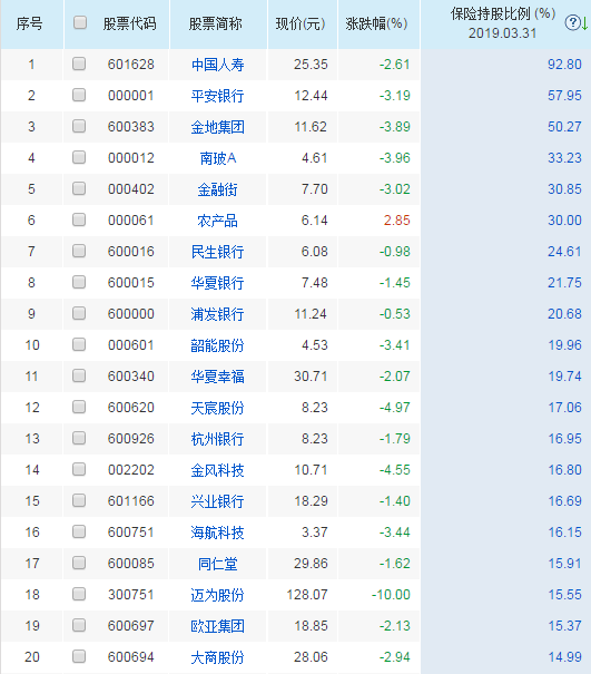 險(xiǎn)資持股比例大于15%的個(gè)股名單如下:
