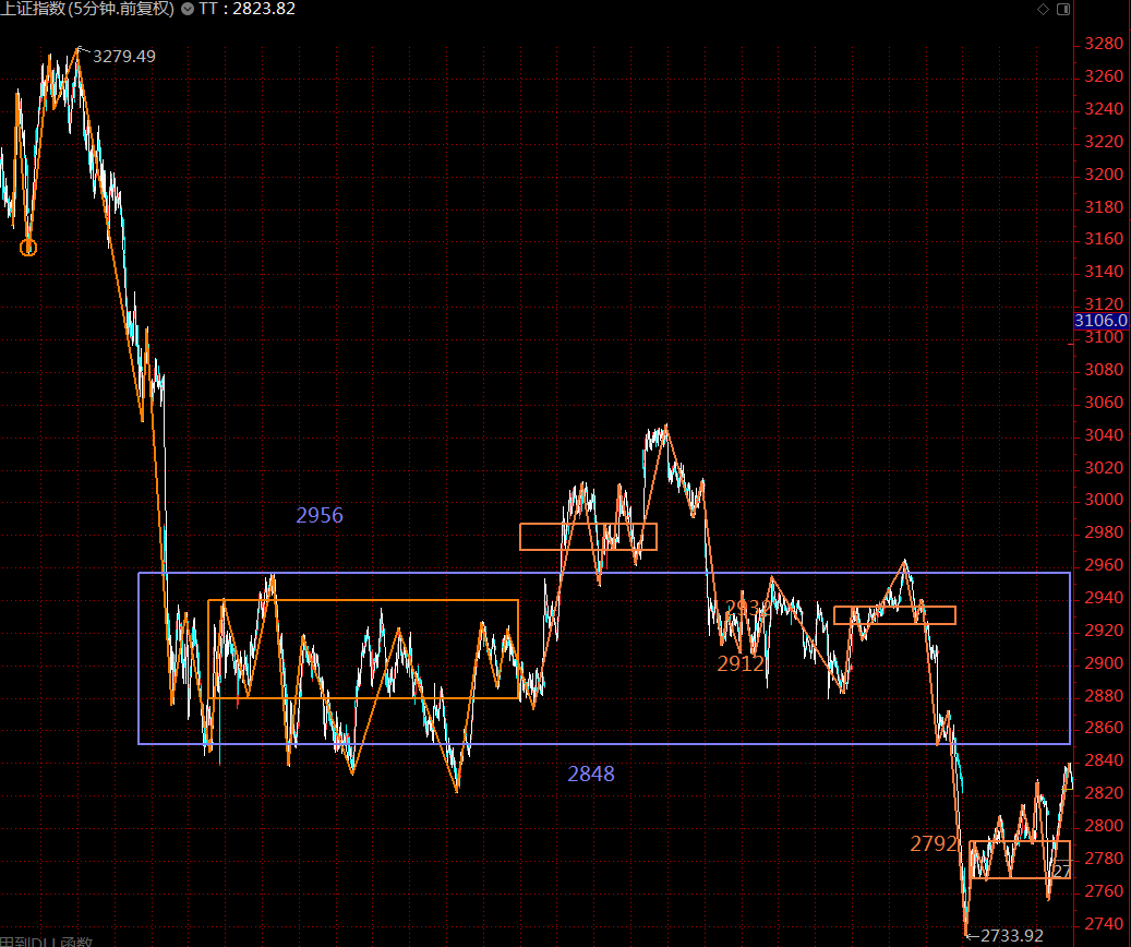 上周市場整體都處在構建第三類賣點的階段,周五的高點2840目前初步確認為第三類賣點的精確位置,如果就此轉下,下一步2792點就顯得尤為重要,如果往下的五分鐘線段未能跌破2792點,那這個位置是一個合理的建倉點,等同于針對下方三十分鐘中樞(九段擴張)的第三類買點。