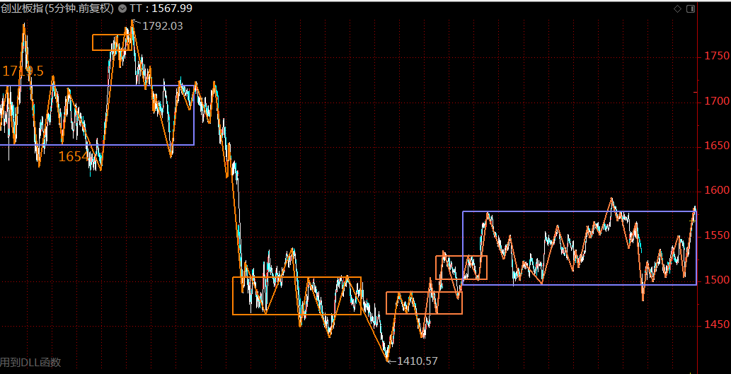 創(chuàng)業(yè)板這里走的比主板強勢很多,周四的陽線直接修復了形態(tài),目前在三十分鐘中樞內(nèi)部運行,中樞上軌1577點,周五已經(jīng)頂?shù)搅酥袠猩宪?,如果下周能突破此中樞,等五分鐘回落線段后構建三買,可大膽介入做多。