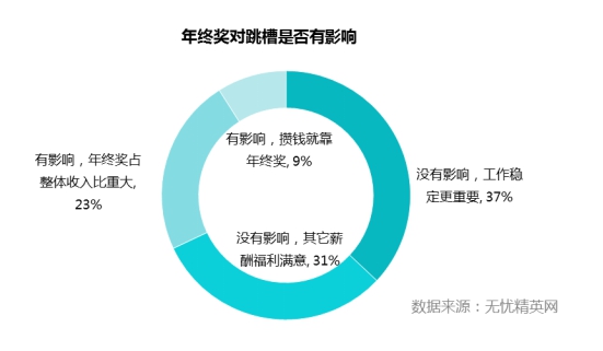 但是即便大部分人對今年的年終獎的增長沒有信心,卻很難讓他們因為年終獎而跳槽。半數以上的受訪者年終獎占全年收入的比例僅為20%左右,即便不滿意年終獎,但工作的穩(wěn)定性、工作環(huán)境、企業(yè)福利是他們更看重的要素。有3成受訪者表示收入依賴年終獎,如果年終獎不滿意一定會尋找機會跳槽。因此企業(yè)在人才管理上,需要特別注意年終獎對于員工保留的影響,提前做好預防工作。