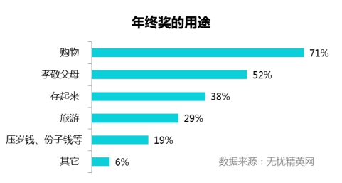 在年終獎的使用上,71%的人會用于購物,52%的人會用于孝敬父母,38%的人會將年終獎存一部分起來,29%的會用于旅行。超過一半的人,以上年終獎的使用類別超過了3項,人生的那點小夢想,全仰仗年終獎?!捌綍r每個月還完房貸,收入只夠生活,提升生活質量,全靠年終獎,去年的年終獎,我給自己買了臺蘋果筆記本電腦;今年的年終獎,準備用來去普吉島旅行,沒有年終獎肯定要哭死?!?剛在上海買了房的小杰告訴我們。