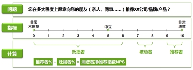 NPS計(jì)算模式:?請(qǐng)用戶回答“您在多大程度上愿意向您的朋友(親人、同事……)推薦XX公司/產(chǎn)品?”根據(jù)用戶的推薦意愿,將用戶分為三類:推薦者(得分在9-10之間)、被動(dòng)者(得分在7-8之間)、貶損者(得分在0-6之間)。?推薦者與貶損者是對(duì)企業(yè)實(shí)際的產(chǎn)品口碑有影響的用戶,推薦者與貶損者用戶在用戶總數(shù)中所占百分比之差,即凈推薦值,如右圖所示。?據(jù)相關(guān)調(diào)查顯示,大部分公司的NPS值在5-10之間。