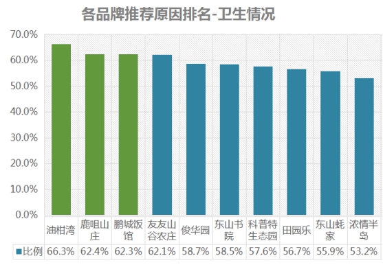 排名第一的是鵬城飯館,餐飲品質(zhì)推薦率為85.6%;其次是田園樂,推薦率為79.5%;第三名是友友山谷農(nóng)莊,推薦率為78.2% 。