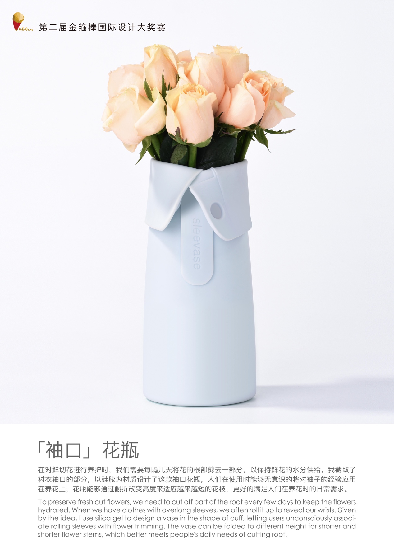 這件作品將衣袖造型應(yīng)用于植物養(yǎng)護(hù),用戶可以通過翻折來改變花瓶高度,從而適應(yīng)不同長(zhǎng)短的花枝。設(shè)計(jì)師抓住了人們?nèi)粘I钪蟹浅<?xì)微的一個(gè)痛點(diǎn),進(jìn)行了大膽的設(shè)計(jì),作品本身簡(jiǎn)約且意趣盎然,同時(shí)具有很強(qiáng)的產(chǎn)業(yè)化可行性,因而也獲得了評(píng)委們的芳心。