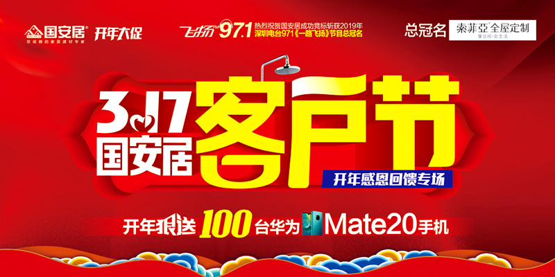 國安居一直心懷感恩,感謝十多年來累計(jì)30萬老客戶的信賴與支持,此次活動不僅是為了品牌優(yōu)惠,更多的是給老客戶送去關(guān)懷和福利。國安居特聯(lián)合深圳電臺971王牌節(jié)目一路飛揚(yáng)鼎力巨獻(xiàn),聯(lián)手旗下百位工廠總裁打造開年大促,推出多重優(yōu)惠:1、開年狠送100臺華為mate20手機(jī);2、聯(lián)購滿額返100萬現(xiàn)金,上不封頂?shù)瘸祷仞伝顒樱?.15為契機(jī)來回饋多年來關(guān)注國安居、支持國安居的廣大消費(fèi)者,以最大限度的優(yōu)惠、最為超值的實(shí)惠、最為驚喜的鉅惠獻(xiàn)禮3.17大促!