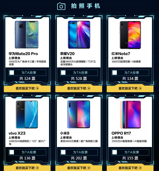 在手機類產(chǎn)品投票中,拍照手機候選產(chǎn)品分別為:華為Mate20 Pro、榮耀V20、紅米Note7、vivo X23、小米9和OPPO R17,截至3月12日榮耀V20暫時領先。