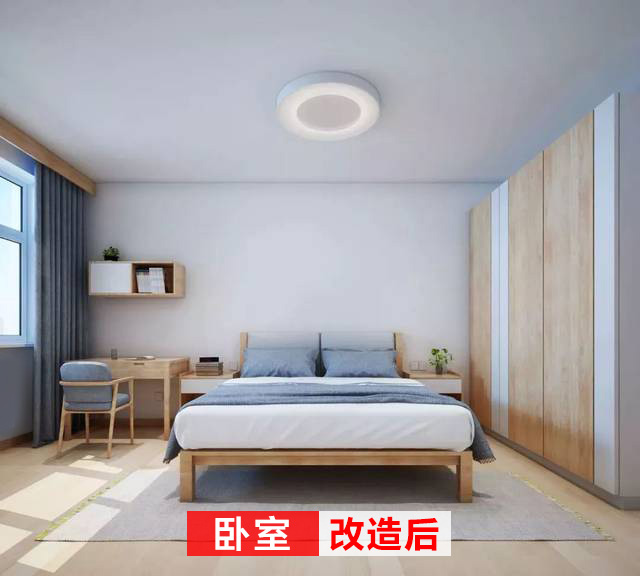 改造后的臥室開闊簡潔,藍灰色床品與窗簾,色調(diào)一致,一整排的衣柜完全可以滿足生活需求。