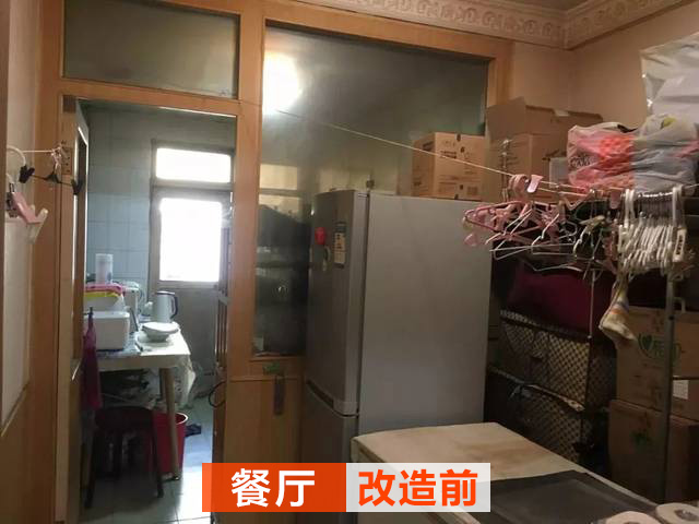 改造前的餐廳不僅僅是餐廳,還有一根晾衣繩,做晾衣區(qū);同樣餐廳也是很亂的,灰色的玻璃看起來很臟。