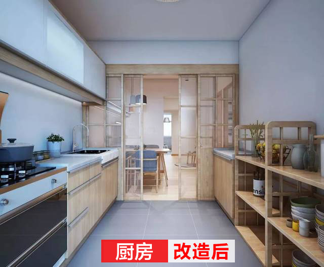 改造后的廚房干凈利索,各個功能區(qū)分明顯,木質(zhì)的隔板、柜子實用美觀,還利用玻璃移門分隔了廚房與外部。