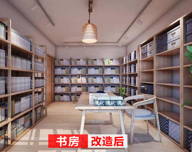 改造后的書房,三面書柜,足夠解決儲存空間不足的問題;有一塊專門用于辦公的區(qū)域,閑時可以坐在懶人椅上看看書,這也是非常寫意的生活。