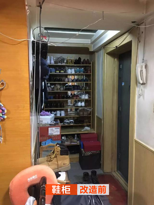 改造前的入戶亂七八糟,而且實用性很差;鞋柜已經(jīng)做到頂了,頂上的鞋子拿取非常不方便,很多的東西都直接堆在那邊。