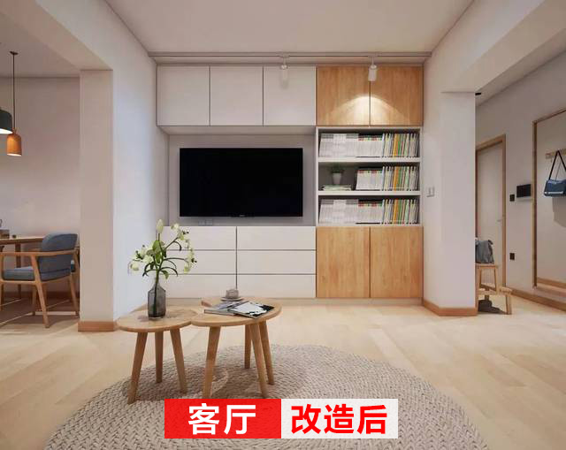 改造后的客廳同樣干凈簡潔,打造一面電視柜做儲物,抽屜+儲物柜+書柜的設(shè)計,能夠滿足客廳的收納需求。