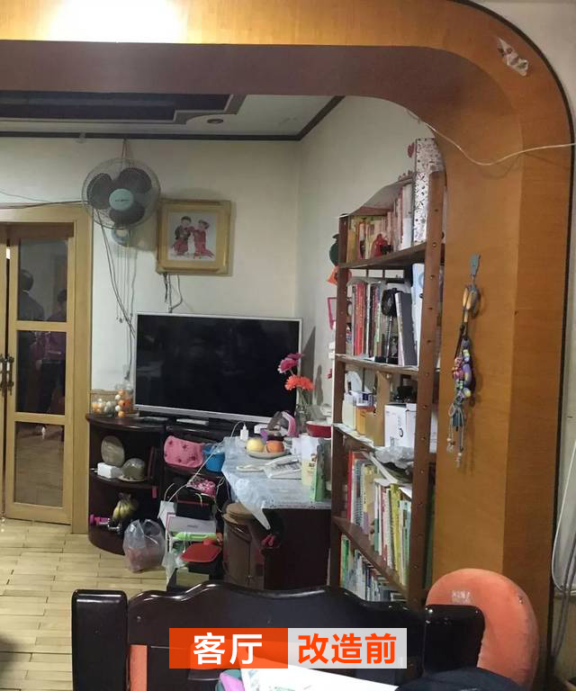 改造前客廳包了一個大門套,看起來不美觀,而且很笨重;客廳也放了一部分書,七七八八的東西塞在電視柜下,顯得客廳也是雜亂無章。