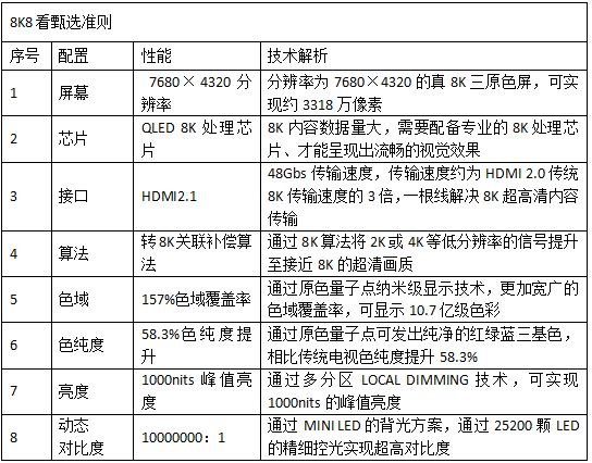 在行業(yè)趨勢(shì)及國家政策的雙重推動(dòng)下,為正確引導(dǎo)8K電視市場(chǎng)發(fā)展方向、加快發(fā)展步伐,TCL聯(lián)合國家廣播電視產(chǎn)品質(zhì)量監(jiān)督檢驗(yàn)中心經(jīng)過長(zhǎng)時(shí)間的市場(chǎng)調(diào)研及總結(jié),從行業(yè)整體的角度對(duì)8K電視進(jìn)行了初步探討,并編制出《8K8看甄選白皮書》。這份白皮書告訴我們,實(shí)現(xiàn)真正的8K震撼視覺體驗(yàn)關(guān)鍵性能/技術(shù)要求如下。