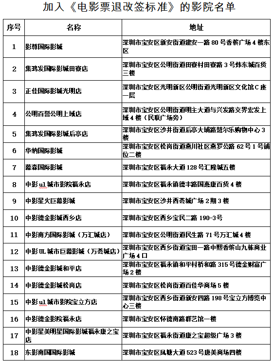 深圳新聞網(wǎng)2019年9月3日訊 2019年3月,深圳市消委會(huì)聯(lián)合深圳市電影發(fā)行放映協(xié)會(huì)于全國率先牽頭推出《電影票退改簽標(biāo)準(zhǔn)》(以下簡稱《標(biāo)準(zhǔn)》)后,截至目前,深圳市內(nèi)共有86家影院自愿加入電影票“退改簽”標(biāo)準(zhǔn),切實(shí)維護(hù)消費(fèi)者的合法權(quán)益。