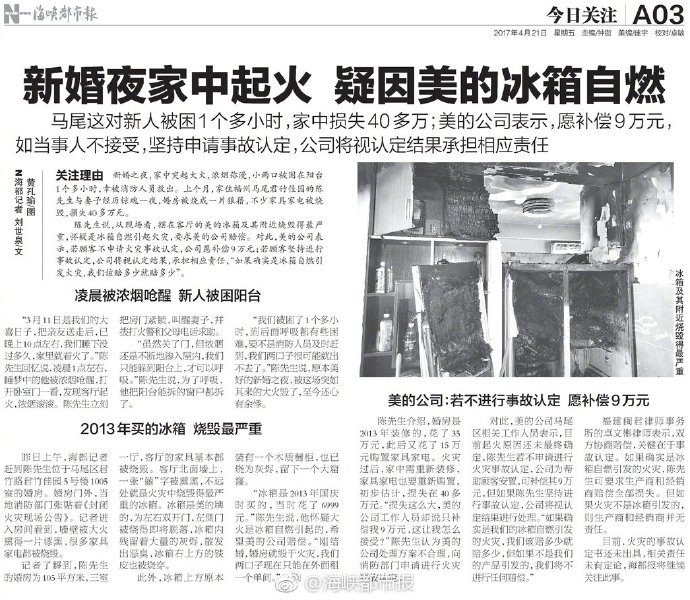 為了解本次案件的相關(guān)情況,《消費(fèi)者報(bào)道》與美的方面進(jìn)行聯(lián)系。11月1日,廣東美的制冷設(shè)備有限公司成都分公司信息中心負(fù)責(zé)人回復(fù)本刊時(shí)表示,美的方面認(rèn)同消防部門(mén)出具的火災(zāi)事故認(rèn)定書(shū),并已經(jīng)根據(jù)此火災(zāi)事故認(rèn)定書(shū)和專(zhuān)業(yè)評(píng)估機(jī)構(gòu)的評(píng)估結(jié)果為吳先生提供經(jīng)濟(jì)賠償方案。如果吳先生不認(rèn)同賠償金額,可以通過(guò)訴訟途徑解決,美的方面會(huì)遵守法律的判決。
