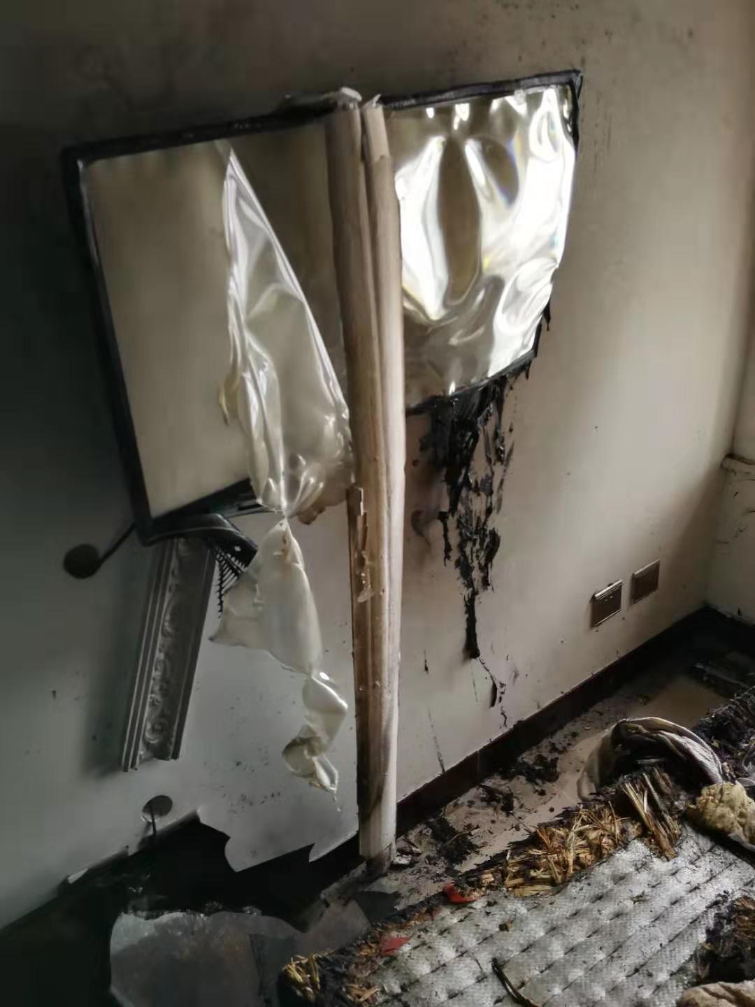 吳先生提供的照片顯示,臥室的床、電視機(jī)、窗戶(hù)等物品都被不同程度地?zé)龤?臥室墻面被濃煙熏黑,涉事空調(diào)也燒得只剩下框架,掉落在地面上。